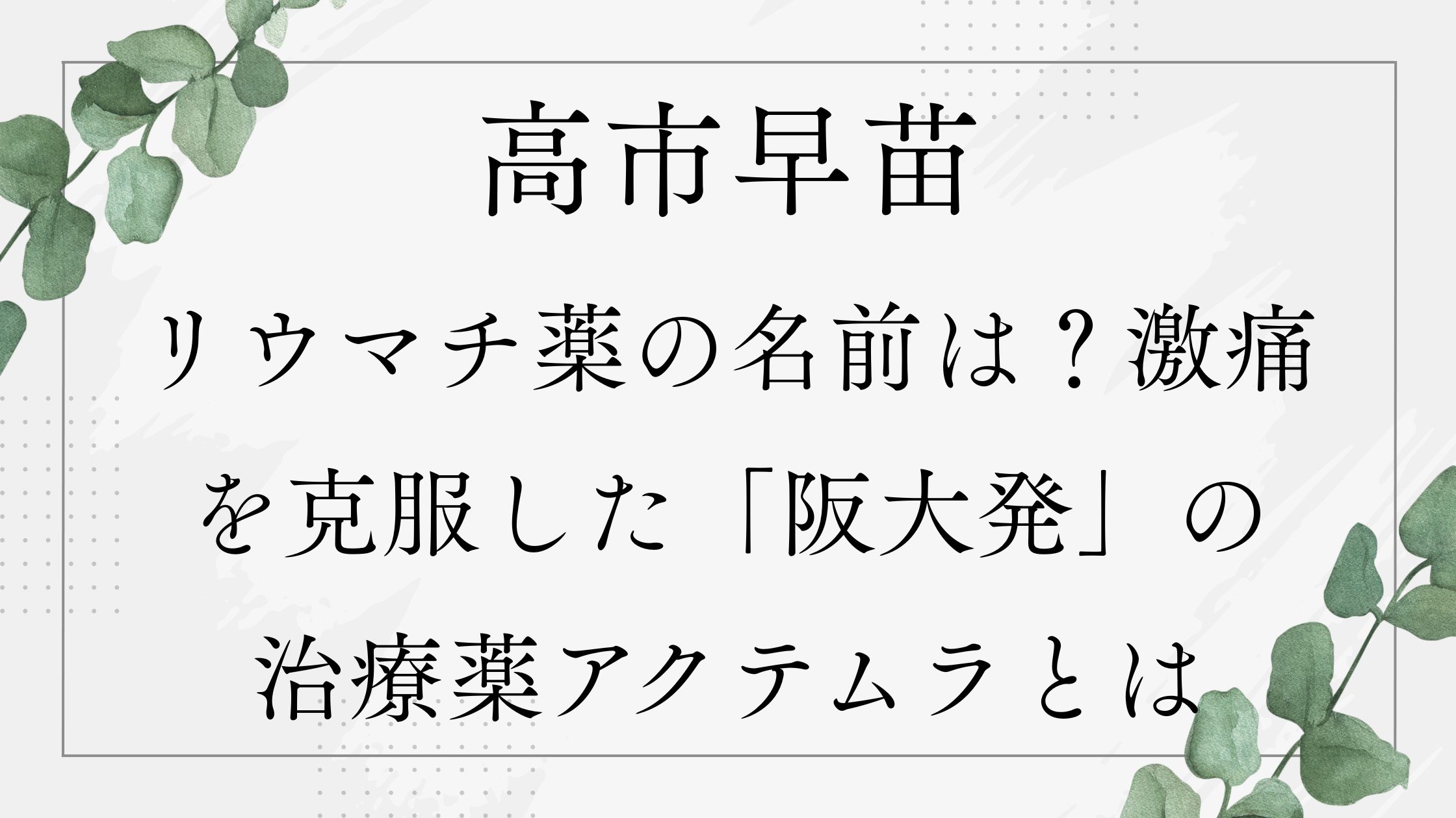 高市氏が自身のSNSや会見などで、「大阪大学発のお薬のお陰で元気になりました」と言及したその薬の名前は、「アクテムラ(一般名:トシリズマブ)」です。